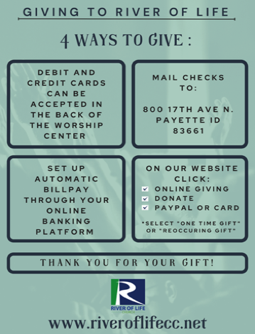 As a convenience to you, contributions to the ministries of River of Life Christian Center can be given online through PayPal or using a credit/debit card.